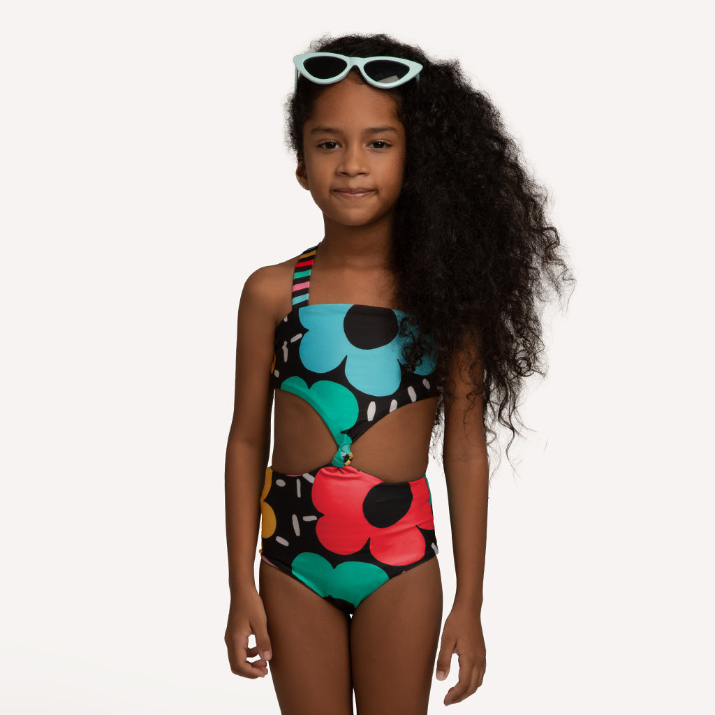 Vestido de baño para niña. Enterizo con cobertura moderadaMezcla de estampados Nudo decorativo en el...
