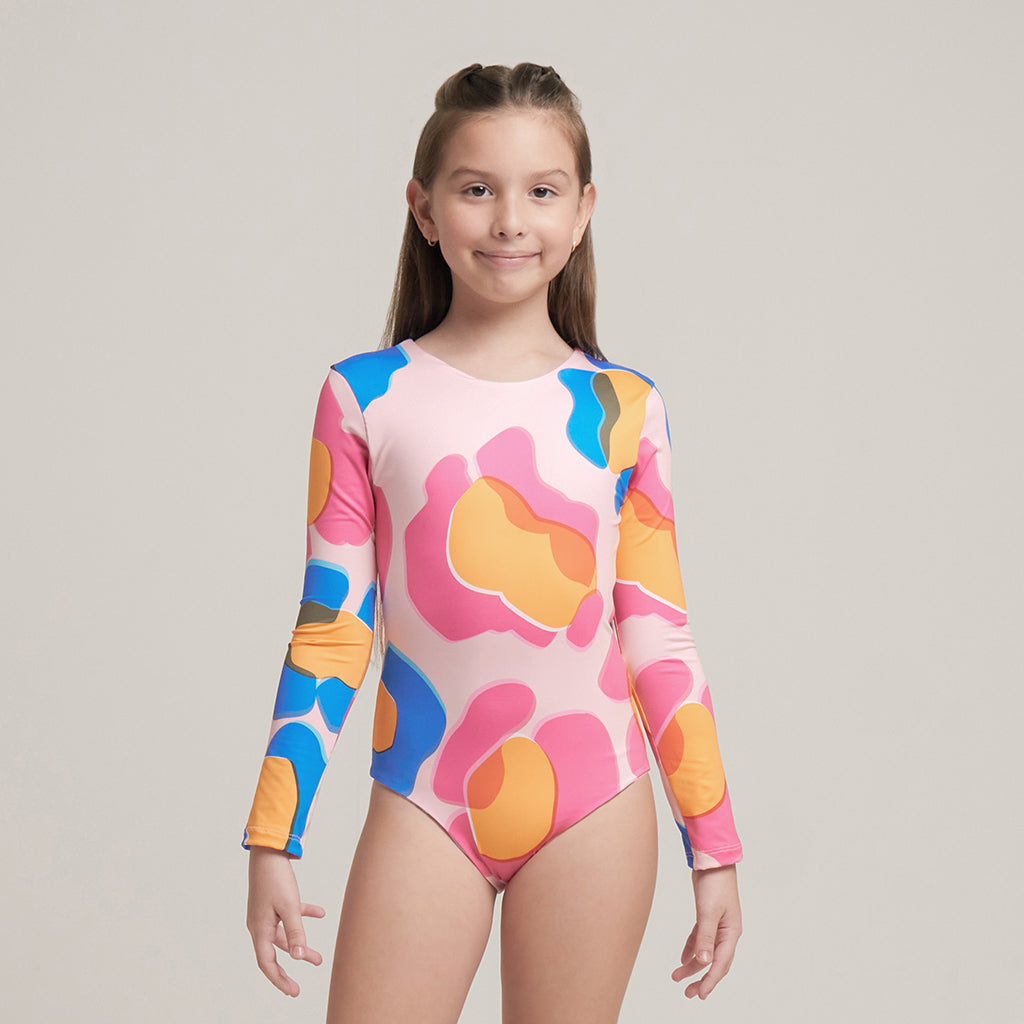 Vestido de baño para niña. Top manga larga con cobertura alta Mezcla de estampados Cuello redondo...